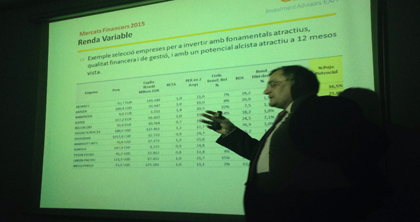 Respecte a aquest tema el sr. Ramon Alfonso aconsella posar -se venedir del Bonos Bund a 10 anys, aconsella fugir dels bons corporatius , preveu una divisa euros $ a 1,10 . Aconsella invertir en Renta variable sobretot Europea i Espanyola doncs els preus de les cotitzacions actuals no reflexen el creixement de les companyies . Es mantenen els creixements dels beneficis empresarials.